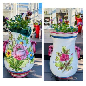 イタリア🇮🇹の花瓶を主人に 割られてしまって😭 ですが、綺麗な花瓶を捨てるには 忍びなく、ピッタリのスリット鉢に ビオラのハートカクテルを植えて はめ込みました💕