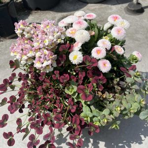 昨日作った寄せ植え🌿🪴🌸 色々集めて、可愛くできたかなぁと自己満足😆笑 こぼれるように咲いてるバーベナさんがポイントかな❓️🌝 手前の株元をクローバーでお洒落に演出してみました☺️