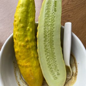 在来種のシロウマきゅうりです。 今日のお昼ご飯です。 ありのままのご飯写真ですみません。 シロウマきゅうりは甘くて美味しいです。 去年まで長年育てていた在来種のきゅうりの種を、私が誤って捨ててしまい😱、代わりに手に入れた在来種2種のうちの1つです。 その捨ててしまったきゅうりや、一般的な緑色のきゅうりと比較すると食べた直後に甘味を感じます。 甘くてみずみずしくて美しいきゅうりです。 去年までのきゅうりは、頭側に苦味があったんですよね。 シロウマきゅうりは、苦味とは無縁ですね。 収穫量は、今のところ去年までの在来種と同様、緑色きゅうりのような毎日余るほど収穫できるような豊作系ではないようです。 その点も良かった。 さて、 来月から軽めの断食を予定しているので、この1週間は、水っぽい食生活です🤭 で、今週ハマっていたのがきゅうりの下に隠れているソース(ドレッシング?) 発酵かぼちゃシードバターにリンゴ酢と生醤油を混ぜただけなんですけど、今日はミックス胡椒をミルで挽いて足してみました。 ナッツバター、 久しぶりに食べたらやめられん😆 こんなんで断食できるのかあああ! がんばります🙏