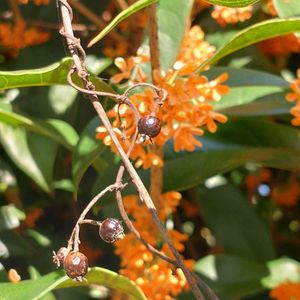 郵便局まで出かけたついでに 少々お散歩 満開の金木犀をバックに 食べ残されたへクソカズラの熟した実 素敵な秋色のハーモニー♫ p