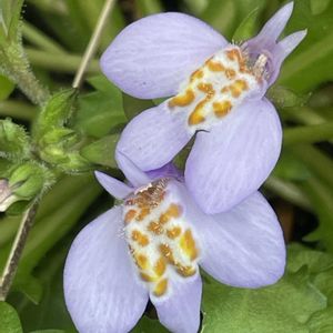 ムラサキサギゴケ サギゴケ科サギゴケ属の多年草 分布: 本州や四国、九州の湿り気のある水田のあぜなどによく群生します。 📝ゴマノハグサ科で分類される場合もあるとのこと。 特徴: 花は直径1.5cm前後 花弁は上にめくれた小さな上唇と、3つに裂けた大きな下唇の花びらからできている唇形花。 花の基部は筒状。 下唇の中央の黄褐色の目立つ斑紋があり、ここに細かい毛が生えている。この斑紋の部分は、虫たちに蜜のありかを教える蜜標で虫が止まる足場の役目をしている。 花の小さな上唇は深裂するが、裂け目の角度が浅くわかりにくい。 上唇の内側に、4本の雄蕊と1本の雌蕊があり、導かれたハナバチの頭や背中に確実に接触して受粉するように出来ている。 柱頭は2つに分れ、触れると閉じる「柱頭運動」があり、送粉者に付着した花粉を積極的に取り込み受粉を促す役割をしていると考えられている。野草も結構したたかですねー (*´꒳`*) 黄色と紫色の斑点の入り方は個体によって異なるそうです。 葉の形と大きさ: 葉は倒卵形または楕円形で、長さは4~7センチメートル、幅は1~1.5センチメートルです。 根元の葉には葉柄がありますが、ほふく茎から出る葉は葉柄がなく、小さく対生します。葉の縁には不規則な鋸歯があります。 似た花で葉の縁の鋸歯はトキワハゼには無い。