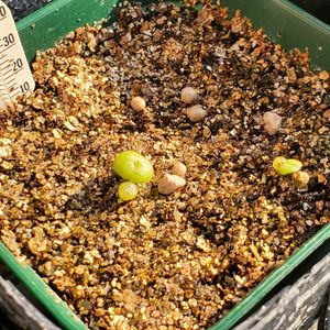 1ヶ月半で、やっとここまで育ちました❗ 以前はこの葉っぱ一枚位が、全体の大きさ。 スポイトや霧吹きで水をやると、水圧で地温計の所までふっ飛んでしまい、冷や汗顔面蒼白になることもありました。今は夜中に上まで給水したら腰水から出して、乾かしながら日に当てて育てています。 今のところ6/40粒発芽で、可能性がある限り諦めずに空鉢も見守っていきます!