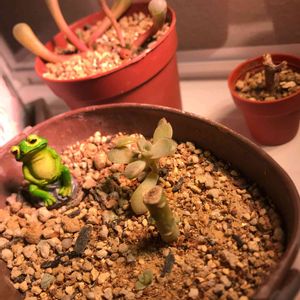 もうだめかな(泣)って思っても諦めきれずに調べては手を尽くし… 手前のは茎から二箇所葉が出てきました🌱 フェネストラリアは間からプクリ。 でも右奥のはカラカラ…😔 ごめんね。。 もっともっと勉強するからね! がんばろうね