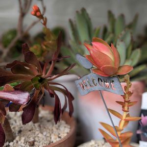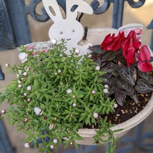 おはよう御座います〜☀ 冬の寄せ植え達です ハナカンザシとガーデンシクラメンだよ✌️😄🎶 可愛いね〜キュートだね💖 ウサギ🐰ちゃんが見守っているよ〜ルンルン💫