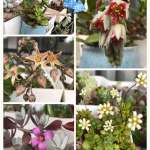 多肉植物のお花たち🌼 月美人さんのお花は金の成る木の背中を借りてまで伸びてきています😄 白銀のの舞は、まだまだ小さいのに今年はお花を咲かせてくれました🎶💞 可愛いです💕
