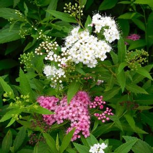 シモツケ(下野)のピンク色と白の花が咲いていました。 バラ科の落葉低木です✨ 花色はピンク💗や白い花🤍がよく見られます💕 葉🌿は楕円形で葉先が尖り、縁のギザギザがあるのが特徴です🎵 シモツケソウという花があり、いつも紛らわしいです😃