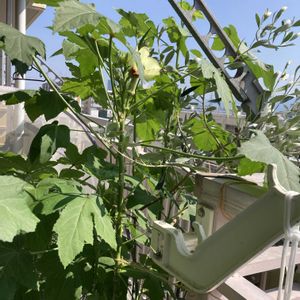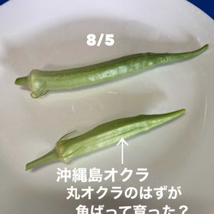 オクラ【水耕栽培】 今年は4種類の、丸オクラと 多角オクラ(まだ収穫出来てません) を育ててますが、植えていない角オクラが育ちました😅 購入している種屋さんの去年の情報で丸オクラにならないと苦情ありと発信されてて、昨年のウチのオクラは大丈夫でしたが.今年になって出て来ました😂 大きくなると筋が硬そうなので、早目に収穫しなくては🧐 タネ屋さんでも交雑あるのかな🧐
