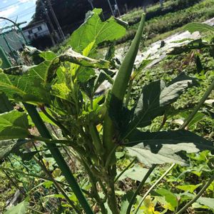 2020.7.1 夏野菜第二号はキューリを追い越して、丸オクラでした(゚∀゚)初モノGET(//∇//) 丸オクラはトゲトゲが少なくて子どもでも収穫しやすくていいな(・∀・)あと硬くなりにくいそうですよ。 オクラはなり出したらどんどん収穫しなきゃいけないと聞いていたので、樹勢を抑えるためあえて二本仕立てにしてみました(=゚ω゚)ノ