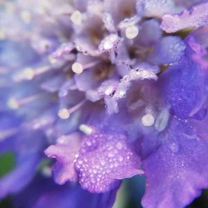 おはようございます☺️ 雨粒シリーズNo.216 今日はスカビオサちゃん💜 🏷️水滴の水曜日 🏷️水曜日は水色 🏷️青い冬の花 🏷️青い花で新年会2022