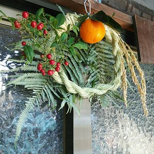 明けまして、おめでとうございます。 いつも、みなさんの投稿を、楽しませていただいています。 今年も、よろしくお願いします。 今年も、しめ縄のお正月飾りを、作ってみました。 材料 ▪バケツ栽培でとれた稲🌾穂と稲藁 ▪庭でとれたミカン🍊 ▪庭の南天🔴 ▪スーパーで買って、残ったウラジロ🌿 昨年と変わらず、雑で不細工…(^_^;)💦