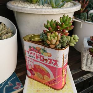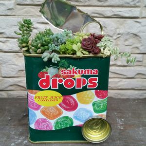 ドロップ😋おひとついかが? ドロップ缶は丸い蓋◎が可愛いと思うので、蓋残しで寄せ植えしました💞 小さな多肉をそっと植えたけど、育ってきましたよ♪