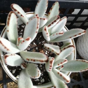 おはようございます🙋♀️ 曇り時々晴れ☀️ 30度 🐇🐇ウサちゃん🐇🐇 小さい鉢(8鉢)ウサちゃんをまとめてみました🐰 あんまり成長は見られないけど可愛く育っています 我が家に来て一歳を迎えます🎉 🐰月兎耳(ツキトジ)🐰 ベンケイソウ科 多肉植物、カランコエ 葉っぱが兎の耳に似た形をして可愛い❤️ ふわふわした白っぽい毛に覆われ、葉の淵に沿って茶色いラインが入ります。そのラインの入り方や葉の色や斑入りで品種が違う💦 「福兎耳」「黒兎耳」「月兎耳錦」よくわからない 一年を通して日によく当てて育てます。 真夏は明るい日陰に置いて強い日差しと高温は🆖 耐寒温度は0℃~5℃ 乾燥には非常に強くむしろ水のやりすぎに気をつける👌 肥料は春~初夏、秋の生育期、液体肥料をたまに与えます😘 葉ざし、茎ざしでふやします。適期は春~初夏です🐰🐰🐰 😊 日照不足と水のやりすぎに気をつけて、がっしりした株に育てることが一番大事😊