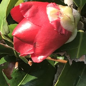 椿 コンロンコク 昨年これを見つけそろそろ咲くかなと見てきた。 日にあたり光輝いていた。 黒っぽい赤が良い