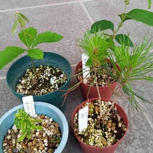 私のミニ盆栽候補たちです。 若葉が伸びてたくましいです。右の花梨と赤松は3本仕立てのうち、2本だけ成長してます。 針金のクネクネ外したハクチョウゲが元気を取り戻したようでうれしいです。