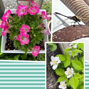 サフィニアブーケ 小梅ちゃんが咲いてきました❁⃘*.゚ 昨日の雨で若干色落ちしていますが、カワイイ色です😍 早くモリモリになってね〜(∩´∀`∩)💕 ブラックベリーも次々咲いています❁⃘*.゚ 今年はジャムにできるか❓ ちょっと気の早いトンボにも出会いましたʚïɞ.•*¨*•.¸¸♬