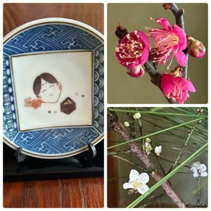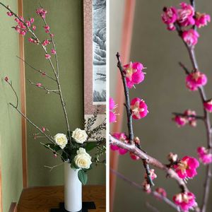 麦、菜の花、ガーベラ、カスミ草、桃の花を購入したが、我が家の八重の紅梅を見栄えの観点で追加
