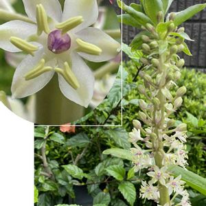 パイナップルリリー🍍 昨年の球根より今年の球根が大きくて5センチ以上ありどんな花になるか楽しみにしてました。 蕾の粒々から開花しなくて下のリップのようなのだけでこのまま終わりかと思ってました。 漸く開花始めました。 昨年の小さいパイナップルリリー🍍は沢山咲きました。 これは植木鉢も倍以上にしてます。 来年が楽しみです。