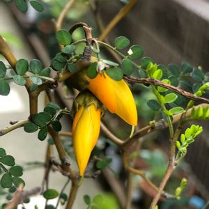 ソフォラ リトルベイビーが咲き始めました。 高さ1m位になってしまいました。 しかも外玄関なので直射日光も当たるし、雨☔も台風➰🌀の風も当たります。 冬場には何回か雪もチラチラ当たります。 買った時は15cm程だったのに大きくなったものです。大きくて深い植木鉢にしたからかもしれませんが、丈夫です。 すっかり葉が落ちてしまい枯れたかなと思っていると又、可愛い🌱葉が出てきます。 多分20年位になるかもしれません。 小さい葉っぱ🌱で遠くから目立たないのがちょっと寂しい。