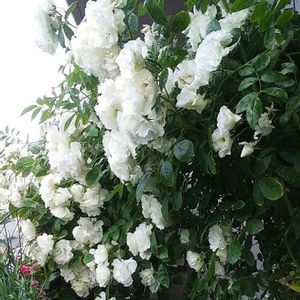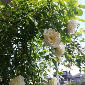 こんばんは😃🌃 今日も一日お疲れ様でした<(_ _*)> 今日はとってもいい天気☀ 久々水やり大変でした😅😄💦💦 一季咲きのツルバラ サマースノー🌹 仕事から帰って来たら咲いていました💓⤴ 昨年花後にうどん粉病になり 古い枝はみな✂ 新しいシュートだけ残したのですが とても大きくなって昨年の3~4倍に なってます⤴⤴⤴ とっても嬉しいのですが これ以上大きくなると困るかな?σ(^_^;)? 嬉しい悩みです~(((^^;)♡♬*♫*♪~