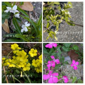 花曇りの今日。 出先で出会った花たち。 1枚目:通りすがりのマンション花壇 2枚目:ソメイヨシノの根元 3枚目:通りすがりの小学校前