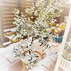 *オリーブの木* ⛄️降ってきましたね オリーブに雪がつもり傾いてしまった 多肉たちも寒そう