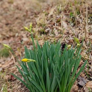 斜面の栴檀の根元付近から自生の水仙が群生しています いつもここの水仙が水仙の一番乗りでしたが 今年はここから離れた白いコブシの根本に先日咲いた株が一番乗りになりました どの株にも蕾が沢山 …八重の黄色い水仙です 🏷蕾応援団