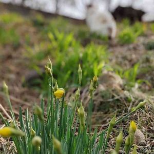 庭パト助手チロと一緒に 斜面を上って帰る途中にも 自生の水仙が一群… 間も無く斜面は水仙の黄色で 華やかになります