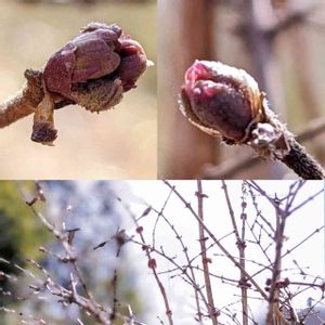 駐車場の西洋鎌柄(上)と 黒文字(下)は隣り合って 植わっています。 どちらも赤い冬芽が 膨らんでいますが 西洋鎌柄は大きい方が花芽 小さい方が葉芽。 黒文字は両側が花芽 真ん中が葉芽です。 🏷蕾応援団 🏷ちっちゃいものクラブ