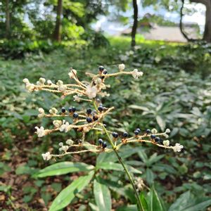 東京 浜離宮恩賜庭園 森の中に入ると涼し気な空気に変わって 見慣れた野草が実り始めていた 黒とは言えない紺色の宝石に姿を変えている アイボリー色の花茎に 丁寧に飾られた宝石の様に 木漏れ日の中で輝きを放っていた 東京で出会えるとは思っても見なかった 此処は園内の避暑地 煩わしさから解き放たれ 癒された場所 藪茗荷⚪🟢🔵♑