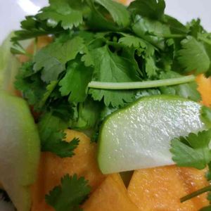 昨日、パクチーを、いただきました。 食べた事が、なくて。 サラダがおすすめと 聞いたので。 きゅうり、 はやとうり 柿 パクチー ポン酢あんど。エゴマ油 パクチー 大丈夫🎵 なかなかいけます。 お代わりして、 いただきました。(笑)