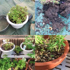 ぎゅうぎゅうだったオレガノ(左上) 朝っぱらから株分けしたら、居候発見😱 コガネムシの蛹になりかけなヤツ💦 (左下)株分け終了。三分の一ずつ、元の鉢とポリポットと地植えに。 イタリアンパセリも鉢植えパクチーも董立ち。もう無理かなー😅開花させて種採ろう。 そして(右下)ローズマリーの鉢、こぼれ種から発芽!?小さくて可愛い〜💕