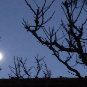 梅の木越しに、月が昇りました。 あと二日で満月🌕️ ウルフムーン…というらしいです。