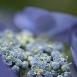 今日のお花 アジサイ ガクアジサイ🌿 (額紫陽花) 丸いアメ玉のような蕾から 小さな花が 咲き始めました🫧🎶 真花(両性花)です *アジサイ科 *アジサイ属