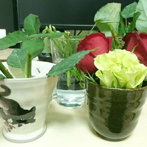 この通りでバラの挿し木チャレンジしたいと思います😃 写真は気まぐれでかなり雑ですが…サムライ08二本とスーパーグリーン一本の切り花から各七本、三本の挿し木素材を取りました。 うまく根っこが出てくれればいいな~ もうちょっと葉っぱをカットした方がいいでしょうか…