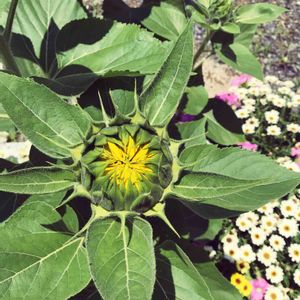 ひまわり第一弾が咲きそう🌻 色々な品種で段になるように植えたけど、全体的に想像してたより低め💦 混み合いすぎて栄養足りなかったのかな… あと、蕾が全部真上に向かってるのが不思議。 お花も空向いて咲くのかな😅