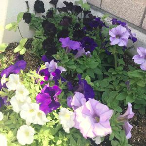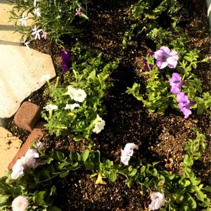 アプローチの花壇 ペチュニア・サフィニア・スーパーチュニアでまとめてます😊 間にチラッと見えるのはひまわりの芽たち✨