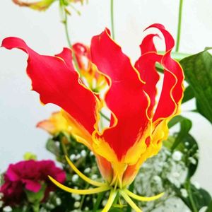 おはようございます( *ˊᗜˋ)ノꕤ*.゚ 今日のお花🧡グロリオサ🧡 燃え上がる炎のような花びらが 見る人を魅了します。 学名 Gloriosa ラテン語で「gloriosus(見事な、立派な)」の意味を持ち 花言葉も 「栄光」「勇敢」と 応援(*・ᴗ・*)وや 栄光を讃える際に相応しい花です。 英名 Glory lily(栄光の百合) Flame lily Fire lily (炎の百合) 和名 狐百合(きつねゆり)は 花の形が狐🦊の顔のように見えることから。 👀確かに コンฅ^•ω•^ฅコン 🦊 いますね~😅 🏷月曜日にビタミンカラー 🏷シミュラクラ現象 参加させていただきますね🙏