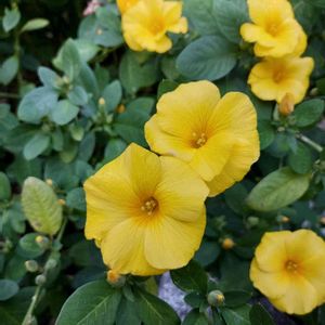 正月二日 素晴らしい迎春花に出逢えました。 °・*:.。.☆キバナアマ(黄花亜麻)☆.。.:*・° キントラオ目 アマ科 キバナアマ属の常緑小高木 山の斜面を覆うように咲き誇る様は 冷たい空気の中 そこだけがまさに春そのもののようでした。 「迎春花」と呼ばれる花に 「黄梅(オウバイ)」がありますが 全くの別種です。 5裂花弁の重なりがとても優しげなこの花は 別名「月光花」の名前の通り、 辺りをその月のような黄色い光で 柔らかく包み込むような柔和な雰囲気を持っています。 晩秋から3月上旬頃まで次々咲き続ける 花期の長い花。 徳島では「モラエスさんの花」として 親しまれています。 眉山町大滝山 和菓子店「和田の屋」庭園にて 2022年1月2日撮影📸 🏷日曜ビタミンカラー♪ 🏷黄橙色の夢