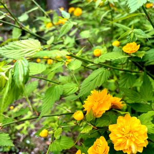 ヤマブキ & ヤエヤマブキ 、 シロヤマブキ 月曜日にビタミンカラー🏷️花はどれも林縁に4月に咲いていて、今は結実の時期ということで(⌒‐⌒) 葉は互生、一重のヤマブキには雄しべがいっぱい🧡 そして実となる(^o^)(2、3枚目) 秋田の「軒の山吹」を見たい‼️ 八重はどなたかがかつて植えられたのでしょうが、お庭ではないので剪定もされず伸び放題🟡3倍体で雄しべは花弁に変化している❇️ 「七重八重花は咲けども山吹の みのひとつだになきぞ悲しき」とあるように実が出来ないのは有名なお話( ´△`) その割によく増えるのは、しっかり根を張って伸びていくからやねぇ(4枚目) シロヤマブキは名前は似ているけれど、こちらは4弁で葉は対生😃当地は自生地ではないので、これもどなたかの植栽でしょう♡昨シーズンの黒い実が残っているけれど、鳥に丸飲みされ運ばれて、またその地で芽吹きを待つ鳥散布種子(5枚目)