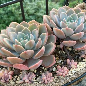 グラプトベリア ピンクプリティ 痩せっぽちだったピンクプリティ、雨晒しハンギングに植えたら、あっという間にどっしり大きくなりました。葉挿しっ子もみんな芽が出ていて増えるのが楽しみです♪