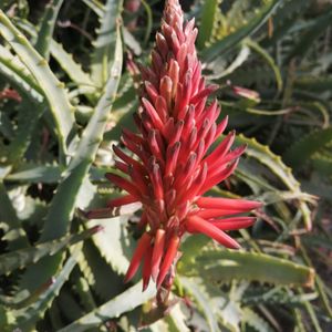 【木立アロエ】《ススキノキ科》 花言葉 「健康」「万能」 別名 蘆薈(ロカイ/ルーホエ) アロエは遥か昔、紀元前の頃から薬用として用いられ、エジプトでは「不滅の植物」として重用されていたそうです。 日本でも昔から「蘆薈(ロカイ)」のという名で、漢方医に用いられてきました。 現在もアロエについての研究は続いており、苦味の元となるアイロンという成分には健胃作用や便秘解消などの働きがあることがわかっています。 またアロエには保湿や抗菌、消炎効果があるとされており、傷や火傷、虫さされの外用薬としても用いられます。 薬用として重用される一方、かの有名なクレオパトラは若さを美貌を保つためにアロエを化粧水として愛用していたといわれています。 ※アロエは種類が多く全てのアロエに上記のような効果はありません。特に観賞用の種類にはほぼ薬効はないとされているので注意してください。 ヨーグルトなどで食べることの多い、食用のアロエはアロエ・ベラという種類です。 皮膚の健康を維持するビタミンC、E、B12、ベータカロテンといった栄養素を豊富に含んでいます。