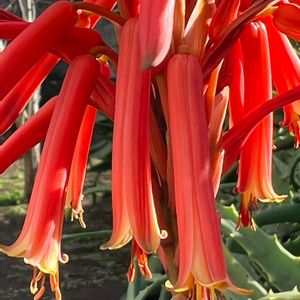 オレンジ色の花が路地に並んで咲いていました。とても不思議な形で初めて見たような。 葉を見てサボテンの仲間かと思ったのですが、調べたらアロエでした。
