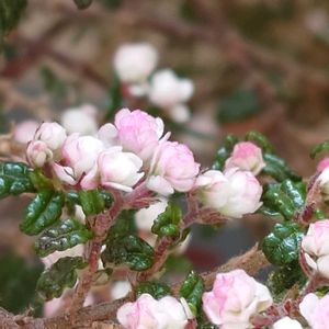昨日載せた天皇梅のお花のアップ🌸 小さくてピント合ってるか微妙だけど🤳 梅の花とは似てなくて、小さくてコロンとした白~ピンク色🌸🌸🌸🌸🌸✨ 店頭には白っぽい株もあったけど、ピンク多めをお迎え🤗 葉っぱは小さくて厚みがあって濃い緑で白でもピンクでも映える組み合わせ🌸🌿 葉や枝ぶりも見映え良いから、お花が終わっても十分楽しめそう🌲✨✨ 昨日からずっと雨で、雨ざらしは心配だから日の当たる軒下に置いてます🙌