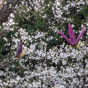 富士桜と咲き始めた紫木蓮、 両方右奥の小屋に似合うように植えてあります。紫木蓮は欲しかった昔ながらのものより少し赤っぽいものになってしまいました。ピンクと白のコブシを食べ尽くしてしまったヒヨドリに気付かれないように祈っています。🙏