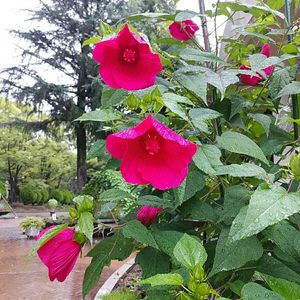 タイタンビカス アメリカフヨウとモミジアオイの交配種とのことです。 2週間ほど前の夕方、訪れた時、タイタンビカスの花は咲いていませんでした( ;∀;) でも、花びらの色が少しのぞいた蕾は、たくさんついていました。 手入れの作業をしている方にたずねると、 一日花のため、作業終了の17時までに、今日咲いた花は全部、摘み取るのだそうです。 わたしが着いたのが遅かったのです( ´-ω-) …というわけで、また、見に行きました~(^-^) 雨🌁の中、見に来るお客さんもいなくて、タイタンビカスが、しょんぼりしているようにも見えました(^_^;) これは、4年目の株だそうです。種子を採取しても、タイタンビカスは、出ないそうです(^.^)