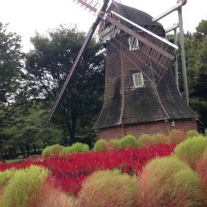風車ʔ༄が素敵なんです… 季節ごとに手前のお花は植え替えられます。今は🌻が一面に広がって🥰