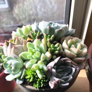 あっしゅさんに頂いたバスタブのリメ鉢に寄せ植えしてみました🛁 真ん中はヘラクレスさん、あとは虹の玉さん、乙女心さん...他色々です...💦 小さいので難しかったです( ˘•ω•˘ ;)ムズカシイ…