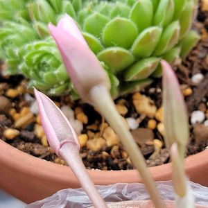 2年ほど前におまけでもらった一株に花芽らしきものがにょろんと出てきました✨🏵✨ いつの間にか子株も育っていました🌿🌸🌿🌸🌿