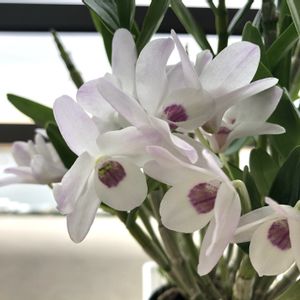 🤍みこちゃん🤍 今年1月に4輪咲いたみこちゃん。 草丈15センチくらいの小型のデンドロビウム。 さらに2輪咲きました✨ 昨年1月のサンシャイン蘭展で購入した4株の内、 一番咲いてくれます。 🏷魅惑のデンドロビウム