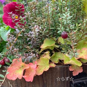 深い霧のクランベリーの森を さまよい歩く。 「この森のどこに宝物があるんだろう」と 探し疲れたパンジーが見つけたのは… 色づいたヒューケラに守られていた 森の赤い宝石✨ あ〜あ、クランベリーは 夏場、日向に置いてたばっかりに 沢山あった実がシワシワに💦 4分の1くらいしか残らなかった。 花を育ててるのって 学びの連続だわ